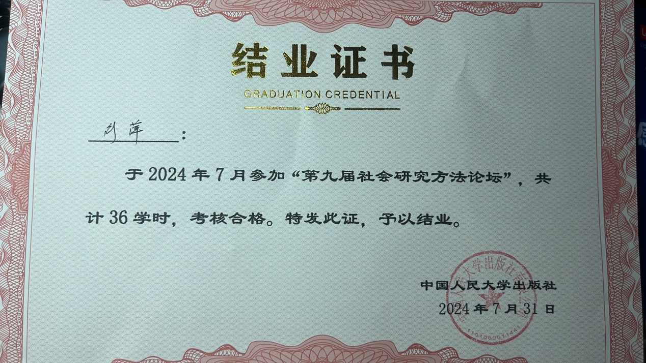 2024年7月28日至8月1日,中国人民大学出版社邀请国内社会研究方法领域的知名专家、学者,于贵州省贵阳市举办了“第九届社会研究方法论坛”。本次论坛共有来自全国来自28个省市,134所院校的240位老师和学生参加,其中线上参会72人。每日大赛 公共管理系刘萍老师全程参加了此次会议,积极参与互动,并获得了本次论坛的结业证书。社会研究方法作为发现社会、探究社会的利器,是社会科学研究的重要工具。国内高校 和科研机构对社会研究方法愈发依赖,尤其在新一代信息技术、人工智能快速发展的背景下, 如何面向新情况更好地开展社会研究,更成为广大科研工作者的重要关切。秉承“服务高等 教育事业,服务一线任课教师”的宗旨,为了进一步促进对社会研究方法的交流和研讨,提 升研究者运用社会研究方法的能力与技巧,人大出版社组织了此次论坛。本次会议议程及主讲人情况介绍如下: