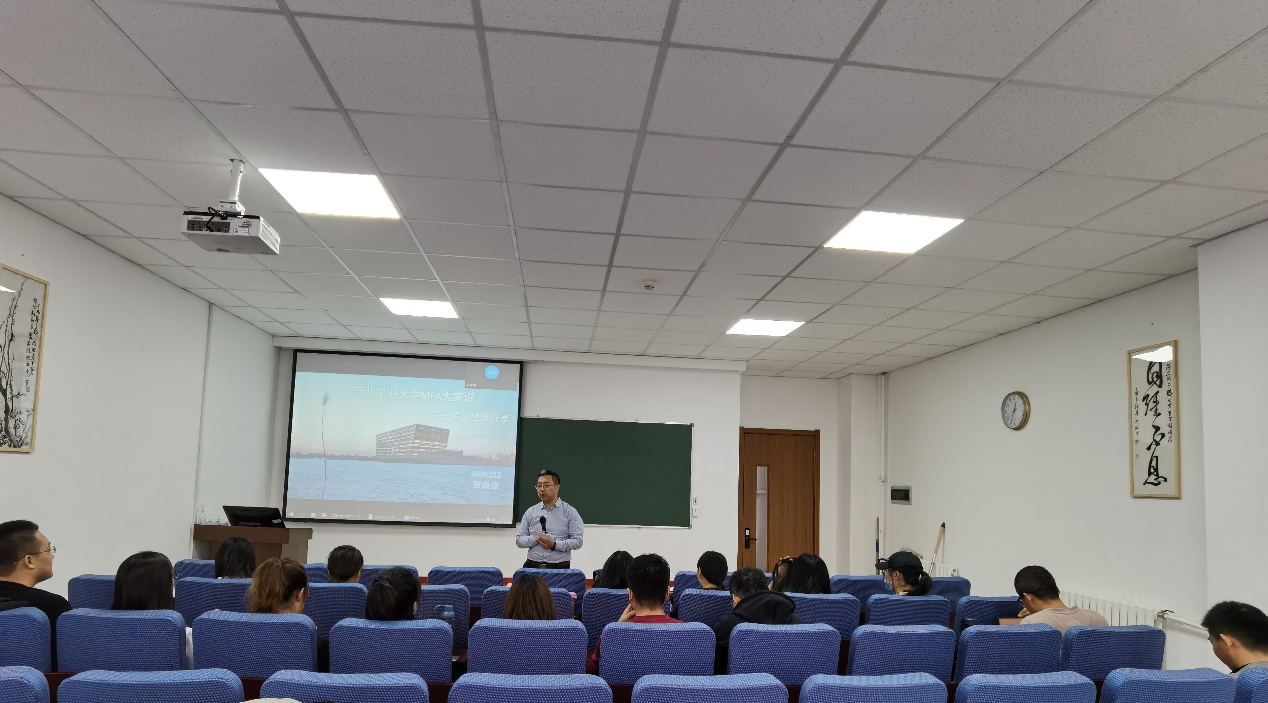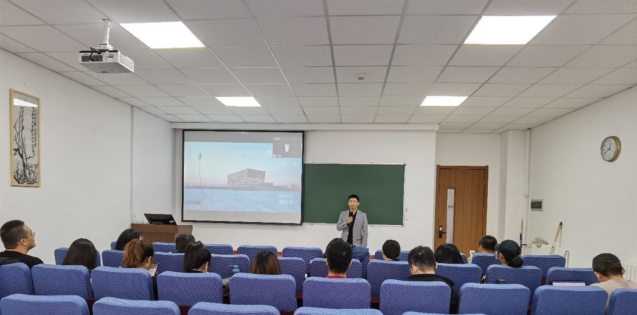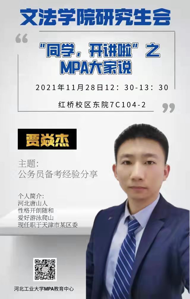 2021年11月28日中午12:30,每日大赛 研究生会MPA大家说第一期,在红桥校区7C104-2顺利举行。本期主讲嘉宾的是MPA212班的贾焱杰同学。活动伊始,MPA中心招生总监张明展老师介绍了MPA大家说的策划缘由、活动目标及未来规划,希望本系列活动能为同学们提供一个新平台,帮助大家互动交流,了解各行各业,提升自我。