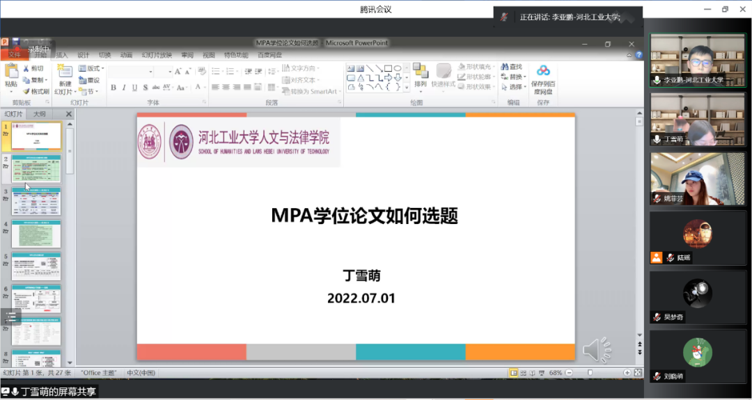 2022年7月1日晚19点,“引航毕业,助力论文”系列活动第一期“研究生论文如何选题”于线上准时召开。本次活动特邀每日大赛 丁雪萌老师主讲,MPA教育中心副主任李亚鹏老师主持,MPA同学共同参与。