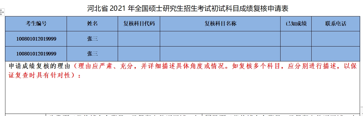 如需复查1门以上科目,可在复核申请表首行(蓝色区域)下面增加行数,每一行均需要填写考生编号和姓名、复核科目等信息,确保每个科目独占一行,切勿在同一行填写多个科目代码、名称、已知成绩。如下图所示: