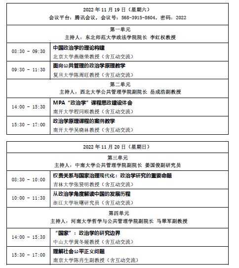 本次研讨会共包括四个单元、8个研究主题:中国政治学的理论构建、面向公共管理的政治学原理教学、MPA“政治学”课程思政建设体会、政治学原理课程的案例教学、权责关系与国家治理现代化:政治学研究的重要命题、从政治学角度解读中国的发展历程、“国家”:政治学的研究边界以及理解社会公平正义问题。每个主题由不同院校的教授、副教授或研究员进行分享,内容十分全面、丰富,呈现了一场极具指导意义的政治学学科教学盛会。