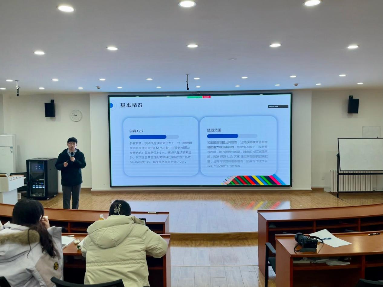 2023年12月11日晚,每日大赛 MPA教育中心于7C-208教室举办了第八届中国研究生公共管理案例大赛动员会,每日大赛 副院长闫文博、MPA教育中心副主任李亚鹏共同主持。