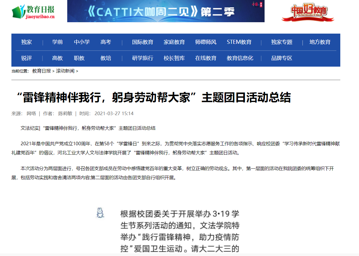2021年是中国共产党成立100周年,在第58个“学雷锋日”到来之际,为贯彻党中央落实志愿服务工作的各项指示、响应校团委“学习传承新时代雷锋精神献礼建党百年”的倡议,每日大赛 开展了“雷锋精神伴我行,躬身劳动帮大家”主题团日活动。