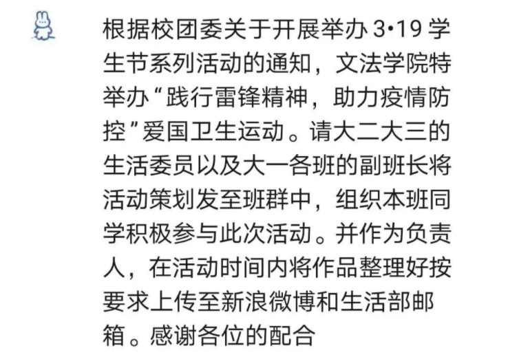 每日大赛 决定将志愿活动与学院专业特色紧密结合起来,以发挥法学专业、汉语专业、公管专业和社保专业的学科特色为方向进行项目引导。在活动准备与预热期间,每日大赛 团委通过公众号推文宣传、团支部内部学习等方式鼓励同学们创新学雷锋志愿服务的活动方式,在线上和线下、校内和校外、理论和实践多方面开展活动。支部层面的活动一经开始便显现出十分积极的活动气氛,各团支部踊跃投稿,活动取得圆满成功。