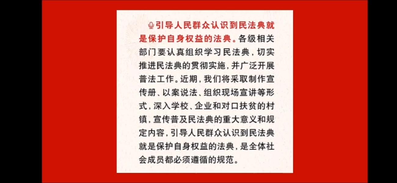 法学191团支部以 “推进民法典普及的最后一公里” 为志愿服务目标展开普法宣传活动。同学们准备了7份关于民法典的宣传视频,并将这些通俗易懂的普法视频提供给基层群众。