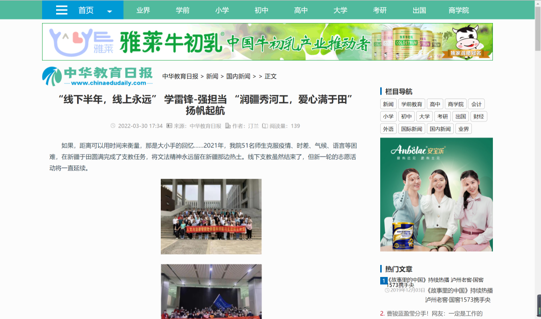 中华教育日报发表《“线下半年,线上永远”学雷锋-强担当“润疆秀河工,爱心满于田”扬帆起航》