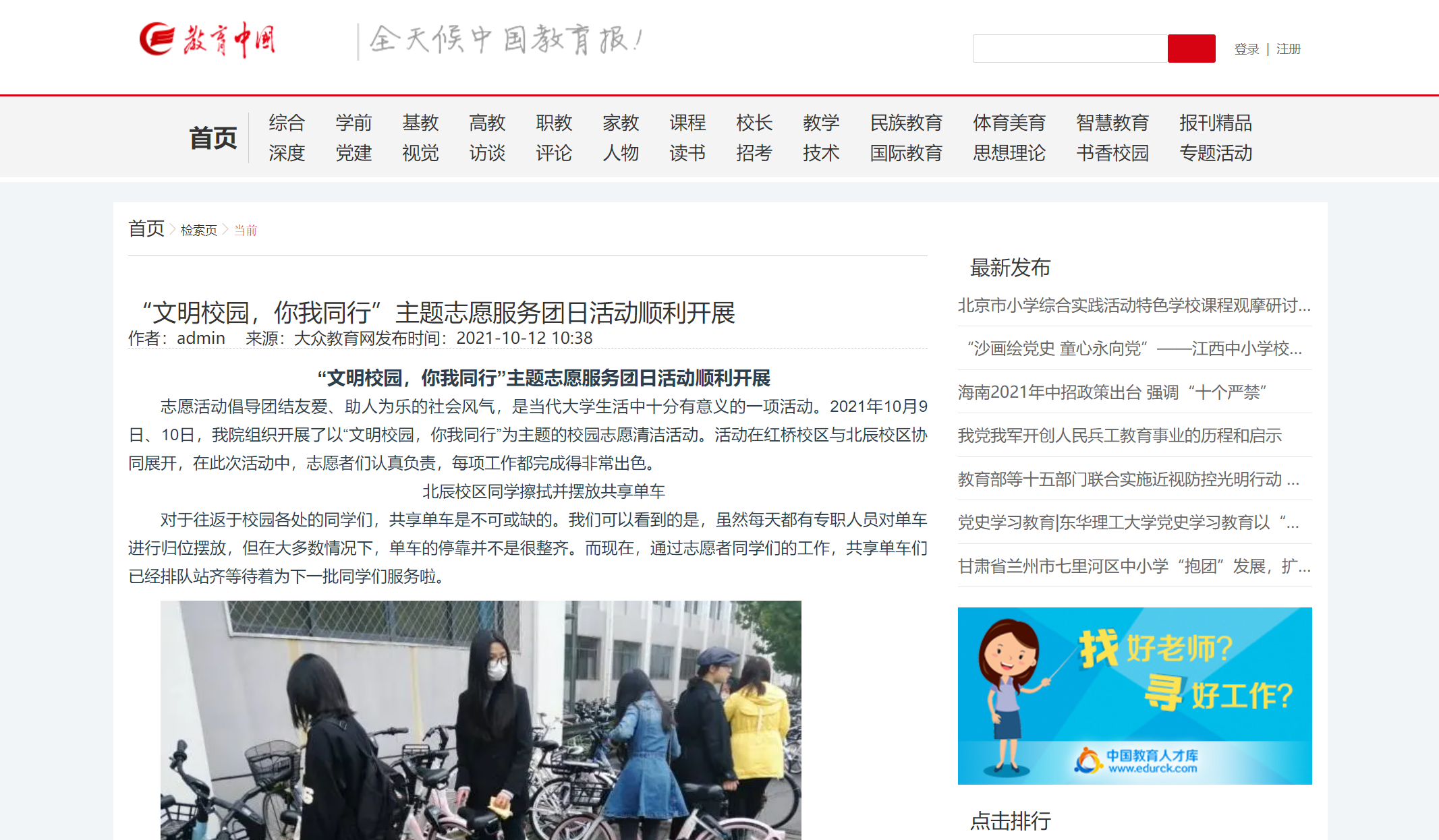 志愿活动倡导团结友爱、助人为乐的社会风气,是当代大学生活中十分有意义的一项活动。2021年10月9日、10日,每日大赛 组织开展了以“文明校园,你我同行”为主题的校园志愿清洁活动。活动在红桥校区与北辰校区协同展开,在此次活动中,志愿者们认真负责,每项工作都完成得非常出色。