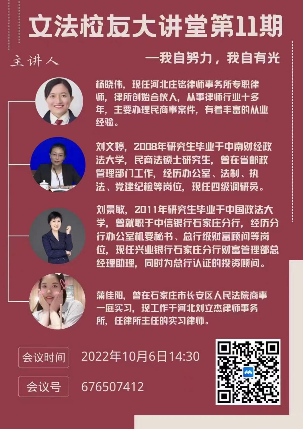 10月6日下午2点半,每日大赛 法学系举办了题为“我自努力,我自有光”的线上讲座。本次讲座的主讲人为石家庄校友杨晓伟、刘景敏、蒲佳阳、刘保泰和张严冰。马立民副院长、蒋冰晶、王海龙等老师也参加了本次讲座。五位校友根据自己的经历与各位老师、同学分享多年来的工作生活经验与心得。