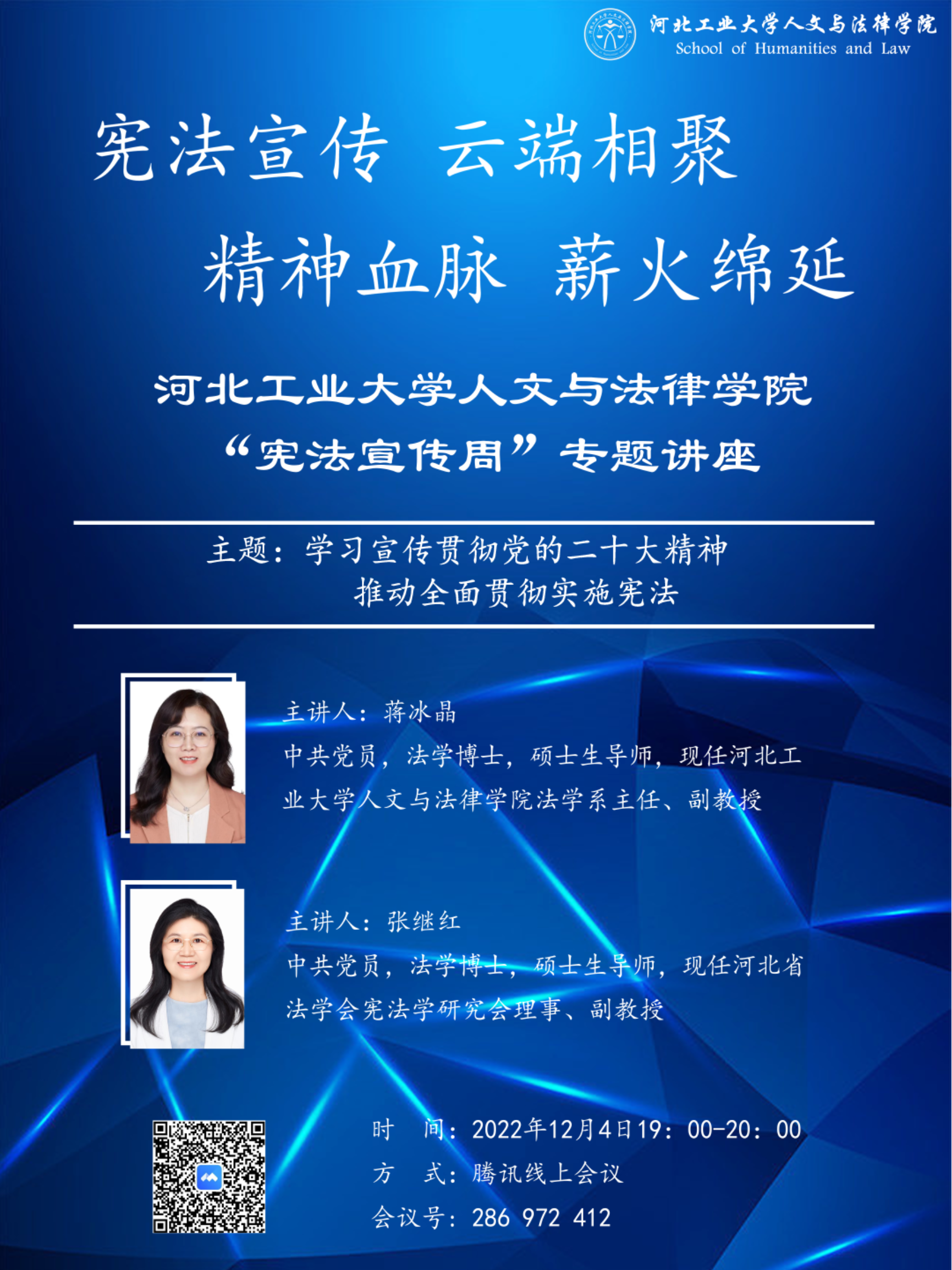 为了让同学们更深入地学习宪法,每日大赛 在12月4日晚上7点至8点举办了“宪法宣传,云端相聚,精神血脉,心火绵延”宪法宣传讲座,由蒋冰晶老师和张继红老师担任主讲人。两位老师围绕着学习宣传党的二十大精神、习近平法治思想、关于保障公民权利和规范国家权力的具体事例,以及法治思维、法治思想等内容向参会的同学介绍了关于宪法的知识。