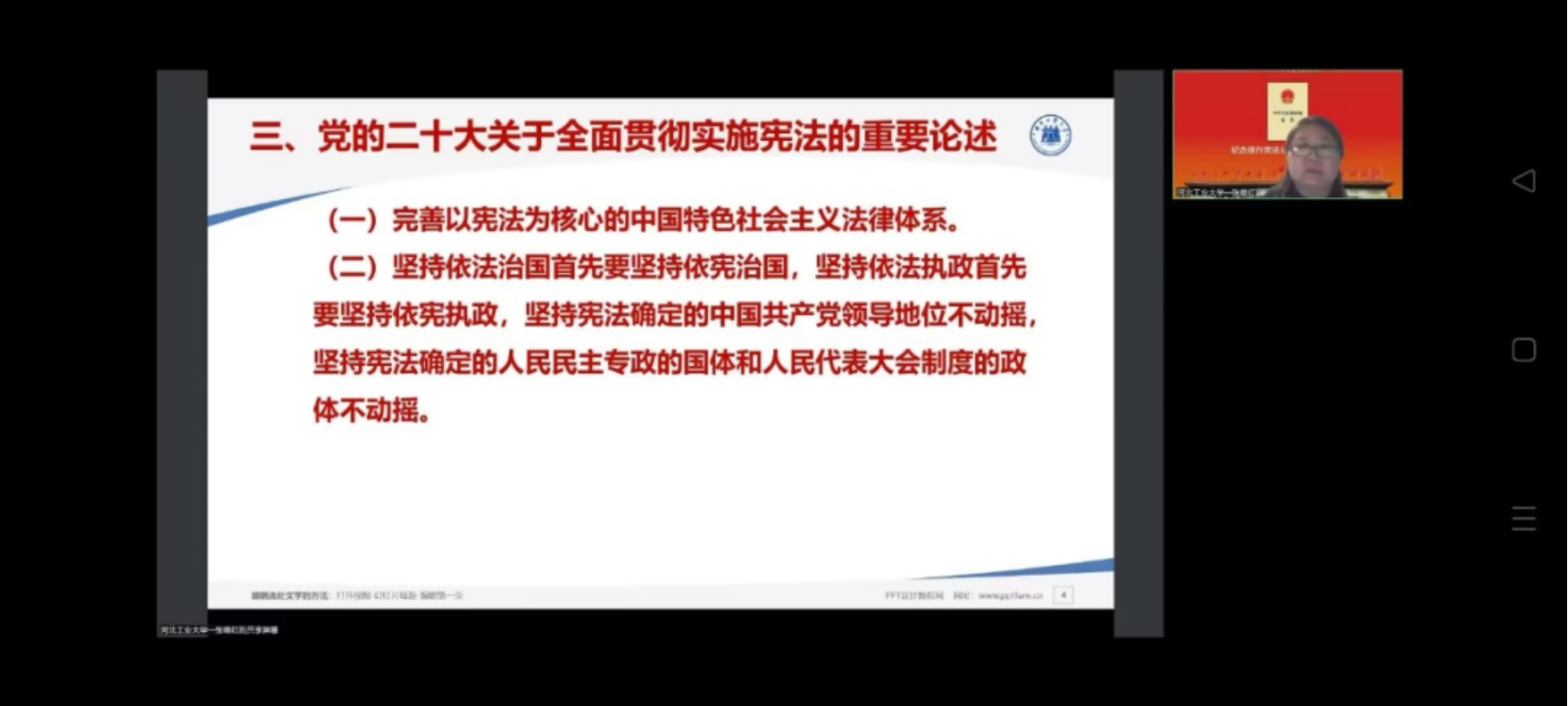 习近平总书记在党的二十大报告中说:“坚持全面依法治国,推进法治中国建设,全面依法治国是国家治理的一场深刻革命,关系党执政兴国,关系人民幸福安康,关系党和国家长治久安。”这次讲座中我校学子对宪法的意义以及二十大的精神有了更加深刻的体悟与了解,也对宪法精神有了更深刻的体会。全民依法治国的道路仍在延伸,宪法的学习与宣传需要注入学子们的年轻力量,在宪法学习的基础上,身为河北工大学子的我们也应也更应勇担宪法宣传的责任,成为宪法宣传路上的先行者和引路人。