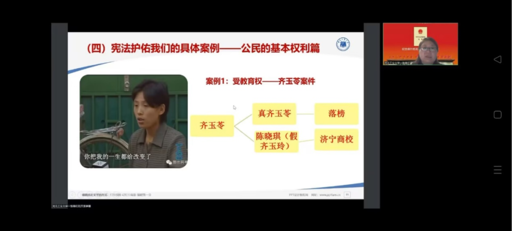在日常生活中,宪法实施实实在在地守护着我们的生活。宪法主要的功能为保障公民基本权利,规范国家权利的行使,防止其滥用公民基本权利两个大方面。张老师结合齐玉苓案、收容教育制度的合法性和合宪性、超市保安是否有权搜查顾客的身体等具体案例,让同学们更加深入地了解了宪法在我们生活中的角色,体会到现行宪法是一部公民权利的保障书,是我们时时刻刻都离不开的。
