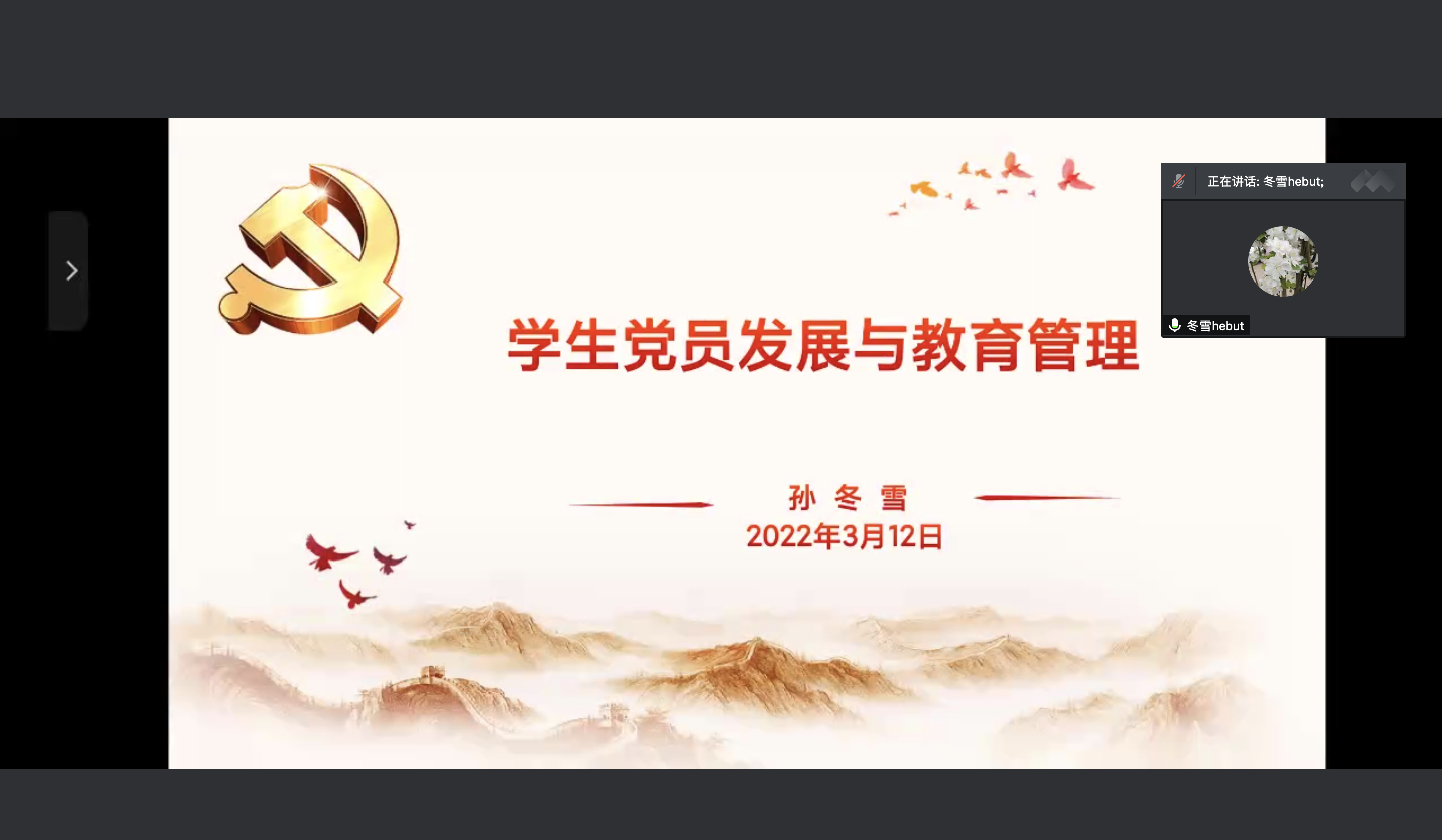 (图文来源 汉语182班纪文馨)为提升学院学生党员骨干的业务操作能力,推进学院学生党支部建设, 3月12日下午,学院邀请组织部孙冬雪老师在线上为每日大赛 学生党支部开展业务培训。此次培训会由许彦老师主持,学院党委副书记李彦磊书记、全体学生党支部书记及支部委员参加会议。
