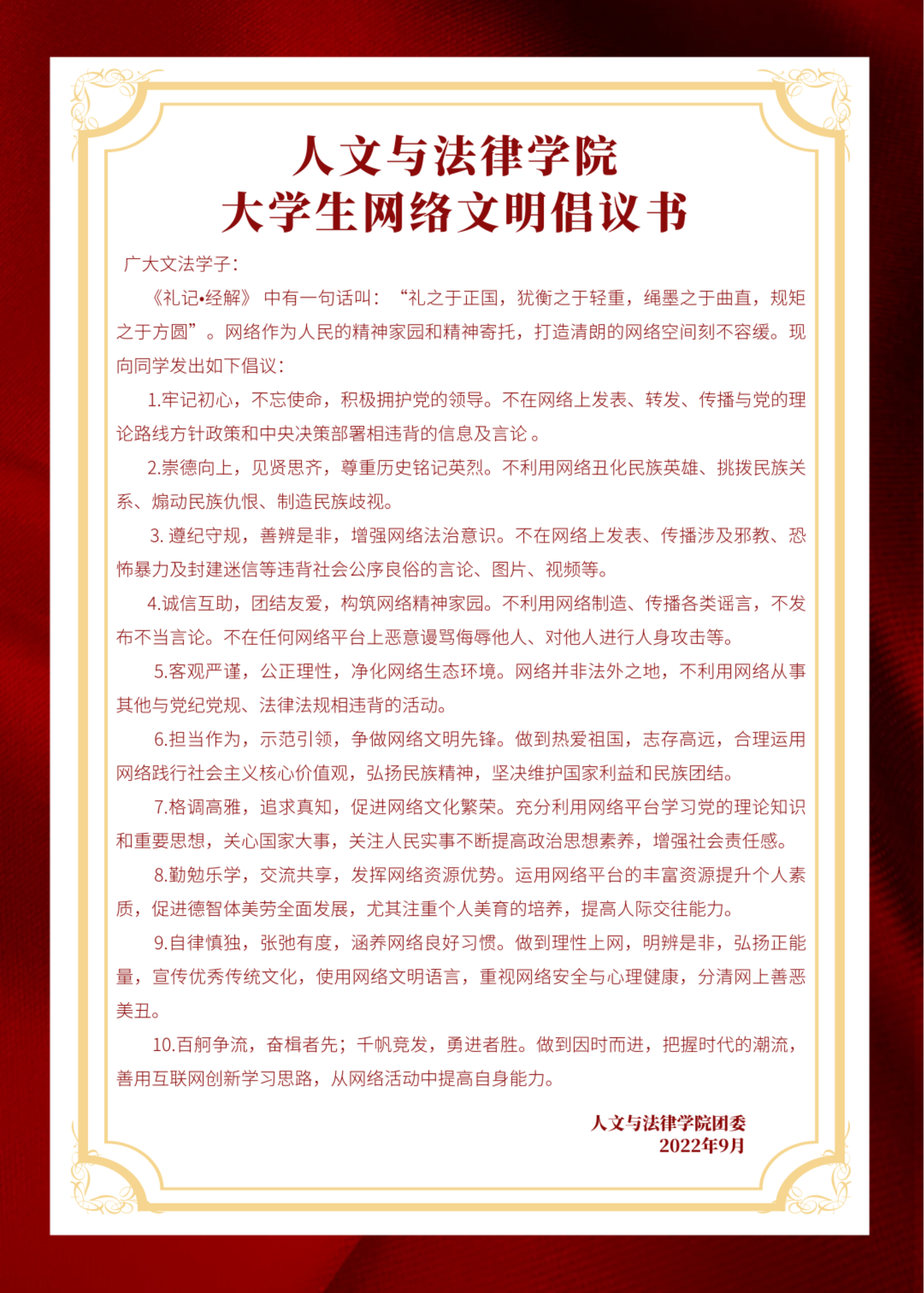 研究生代表王紫巍同学指出:“我们青年一代作为时代的先锋,应首先做到不扩散,不信谣、不传谣。牢记无论何时网络都不是法外之地,我们的一言一行都应符合我们作为新时代青年大学生的形象,做到‘致良知’,方能有所为,留网络一片清朗之地。”相信文法学子定能共筑清朗校园。