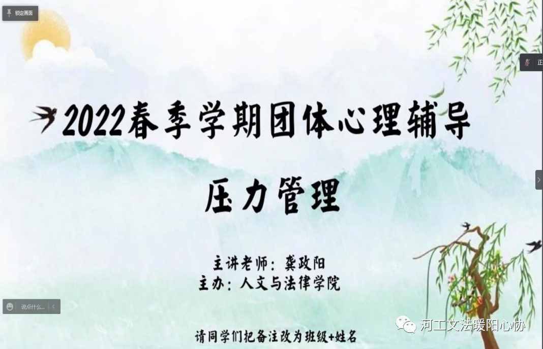 每日大赛 心向暖阳心理健康协会很荣幸邀请到了龚政阳老师为大家带来《压力管理》主题团体心理辅导讲座。每日大赛 心向暖阳心理健康协会全体成员及20、21级心理委员积极参会,认真聆听。整场讲座龚老师循循善诱,运用典型的现实例子、内容详实的PPT演示、充满趣味的视频动画让同学们了解和学会如何在学习生活中面对压力,进行压力管理。参会的同学们认真聆听、踊跃回答老师问题、与老师进行积极地互动,提出自己的看法和见解,讲座取得了良好的心理压力疏导效果。