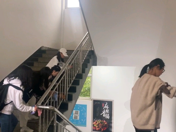 浩浩荡荡的干饭人大军经行后,难免会在楼梯上留下一些积灰和泥尘,而我们的志愿者则运用手上的工具,一丝不苟地清理着台阶与栏杆。他们在这一方小小的天地中洒扫庭除,留下光洁的地面和干净的楼梯扶手。