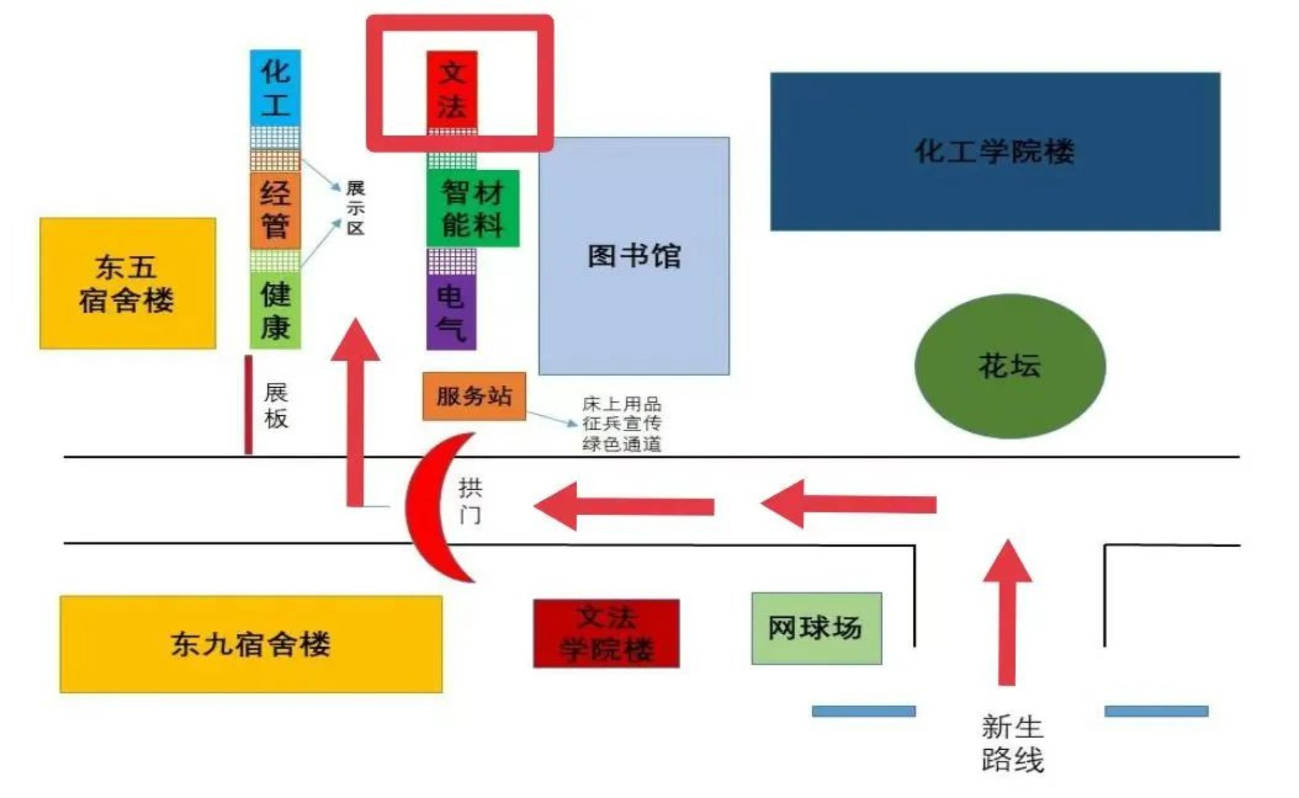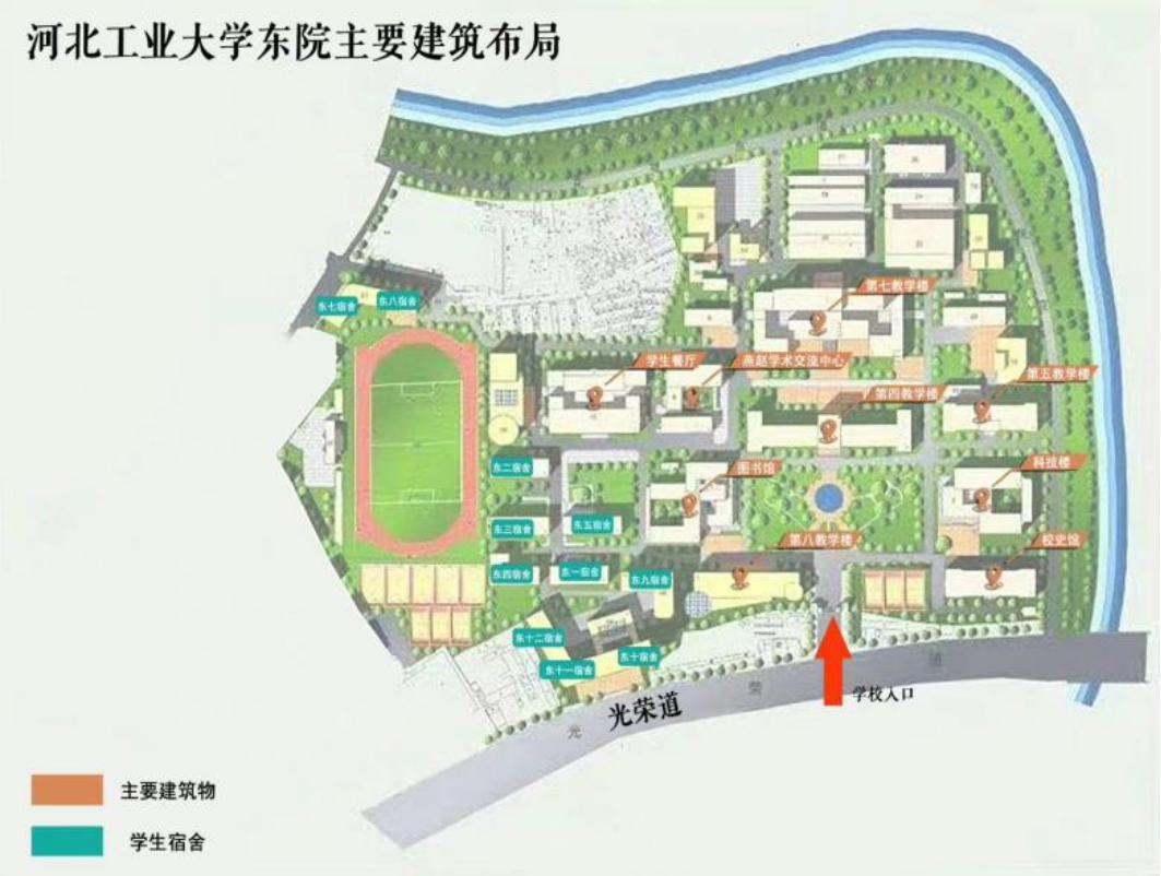 新生们进入东院校门口后,向左方向拐弯直走便可看到图书馆,随后到达位于图书馆西侧的报道点。新生女生宿舍是东二宿舍,新生男生宿舍是东三宿舍。报到路线图和每日大赛 东院主要建筑布局图如下所示。