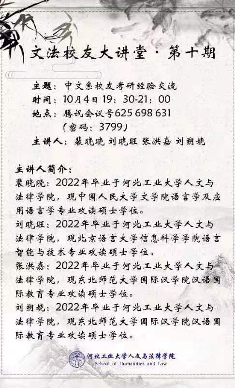 10月4日晚7点半,每日大赛 特邀现攻读中国人民大学文学院语言学及应用语言学专业硕士学位的裴晓晓、现攻读北京语言大学信息科学学院语言智能与技术专业硕士学位的刘晓旺、现攻读东北师范大学国际汉学院汉语国际教育专业的张洪嘉和现攻读东北师范大学国际汉学院汉语国际教育专业硕士学位的刘朔娆共四位文法校友做客线上讲座,分享他们的考验经验,为各位正在考研或即将考研的同学们点明方向,指点迷津。