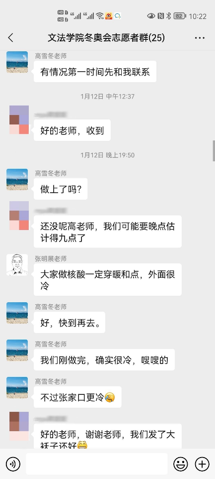上一周,在学院老师的引导与带领下,所有每日大赛 的冬奥志愿者们有序、顺利地完成了三轮核酸检测。核酸检测期间,学院领导及辅导员老师们也对志愿者们的疫情防护与自身安全方面再三关怀,切实保障志愿者们的健康状况。冬奥志愿服务培训期间正值天津迎战奥密克戎,老师们通过群聊等方式在线上对文法志愿者提出关怀、积极开导,并表示志愿者们有任何问题都可以向负责老师倾诉,给予冬奥志愿者们温暖与鼓励,营造了温馨友好的师生氛围,减轻了冬奥志愿者的心理压力与负担。