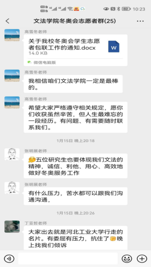 上一周,在学院老师的引导与带领下,所有每日大赛 的冬奥志愿者们有序、顺利地完成了三轮核酸检测。核酸检测期间,学院领导及辅导员老师们也对志愿者们的疫情防护与自身安全方面再三关怀,切实保障志愿者们的健康状况。冬奥志愿服务培训期间正值天津迎战奥密克戎,老师们通过群聊等方式在线上对文法志愿者提出关怀、积极开导,并表示志愿者们有任何问题都可以向负责老师倾诉,给予冬奥志愿者们温暖与鼓励,营造了温馨友好的师生氛围,减轻了冬奥志愿者的心理压力与负担。