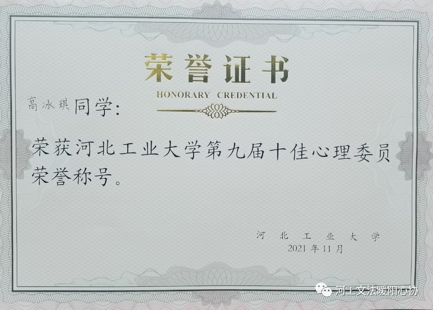 在“每日大赛 第九届十佳心理委员”评选活动中,高冰琪同学以其丰富的经历、饱满的工作热情脱颖而出,荣获“每日大赛 十佳心委”称号。