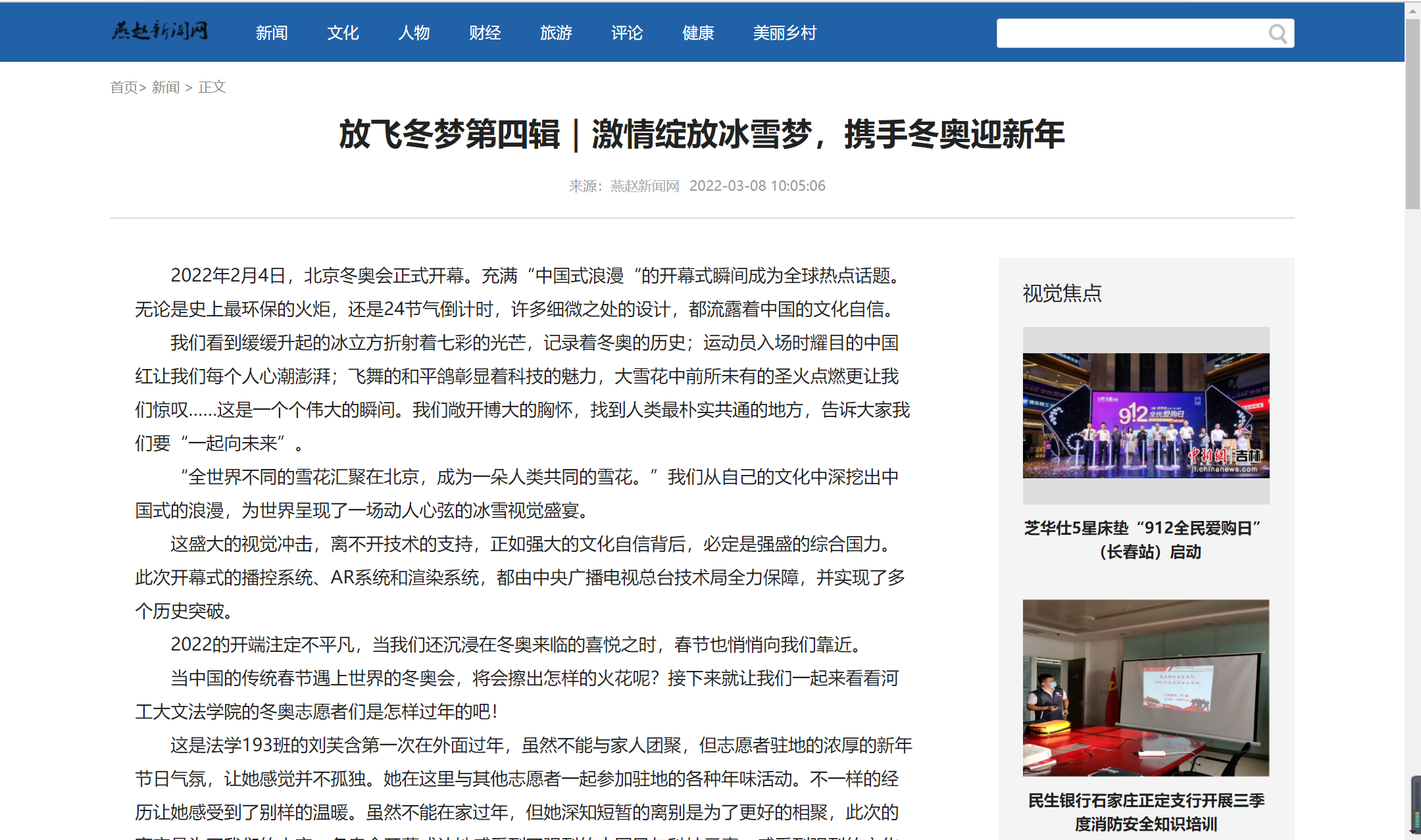 法学193班侯泽勋是国家越野滑雪中心赛事服务领域的一名志愿者,这是一个令她喜悦和期待的新身份,主要负责观众引导和检票验票工作。成为冬奥志愿者是幸运,但在春节前后承担这份幸运的同时也有对亲人无尽的思念。在驻地看完北京冬奥会开幕式后,侯泽勋认为国旗在普通中国人手中相传这个瞬间最直抵人心,普通的老百姓用手手相传的方式着表达人民和国旗之间的情感。