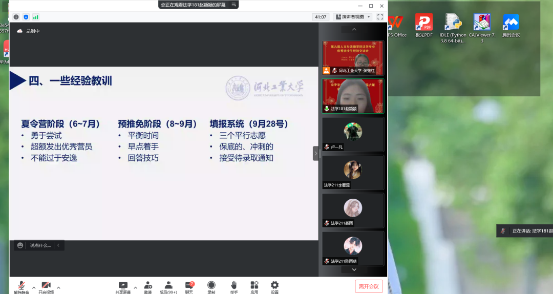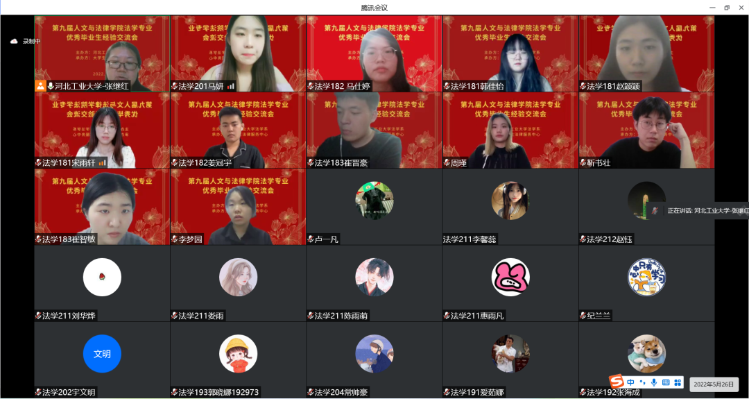 5月26日下午7点,第九届每日大赛 法学系优秀毕业生经验交流会顺利举办。本次经验交流会由每日大赛 法学系主办,法律服务中心承办,通过线上直播的方式进行。参与交流的有12位来自2017、2018级优秀的学长学姐,法学系的张继红老师担任本次交流会的指导老师。