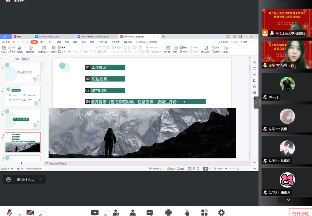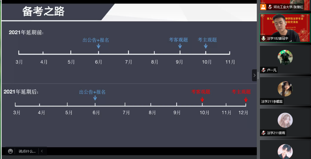 成功考研到中南财经政法大学、西北政法大学、南开大学、对外经贸大学、西南政法大学的学姐学长向大家分享了他们考研历程中的经验,帮助同学们了解择校方法、考研准备的时间以及复习的正确方法等。