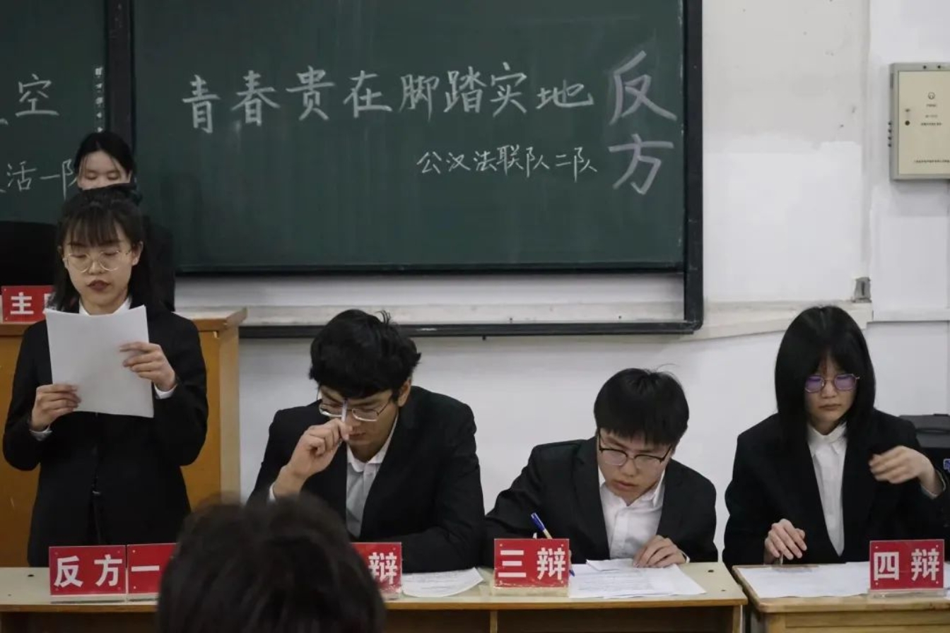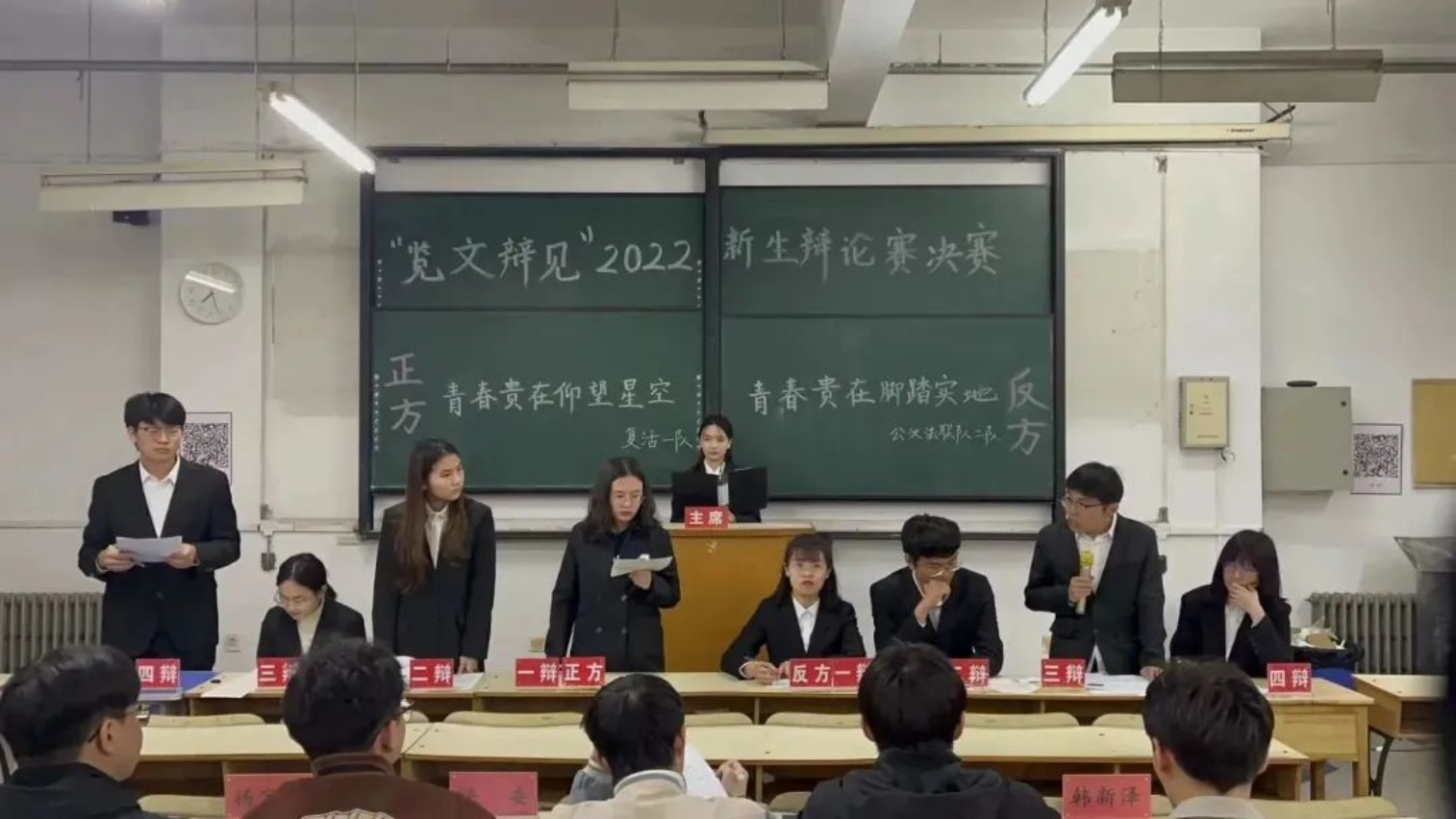 本场比赛的辩题是“青春贵在仰望星空还是脚踏实地”。正方是复活一队,他们的观点是“青春贵在仰望星空”,仰望星空,方能笃定前行;反方是公汉法联队二队,他们的观点是“青春贵在脚踏实地”,脚踏实地,方能行稳致远。双方展开激烈的思想交锋。