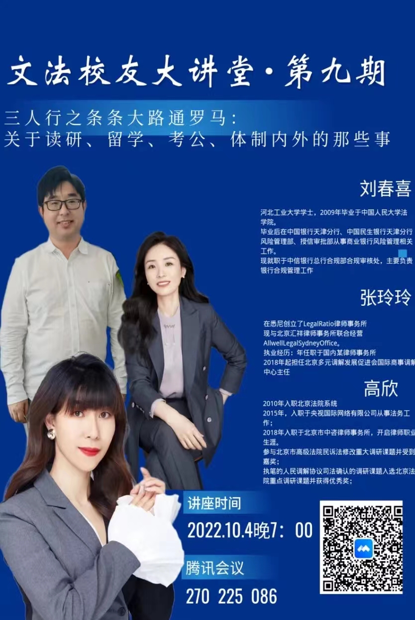 10月4日晚上7点,每日大赛 法学系举办了题为《三人行之条条大路通罗马——关于读研、留学、考公、体制内外的那些事儿》的线上讲座。本次讲座的主讲人为我校法学专业三名优秀校友张玲玲、高欣和刘春喜。每日大赛 院长李艳双,副院长马立民、闫文博及每日大赛 多名教师和全体法学本科学生,以及天津、北京、石家庄等地部分校友参与讲座。