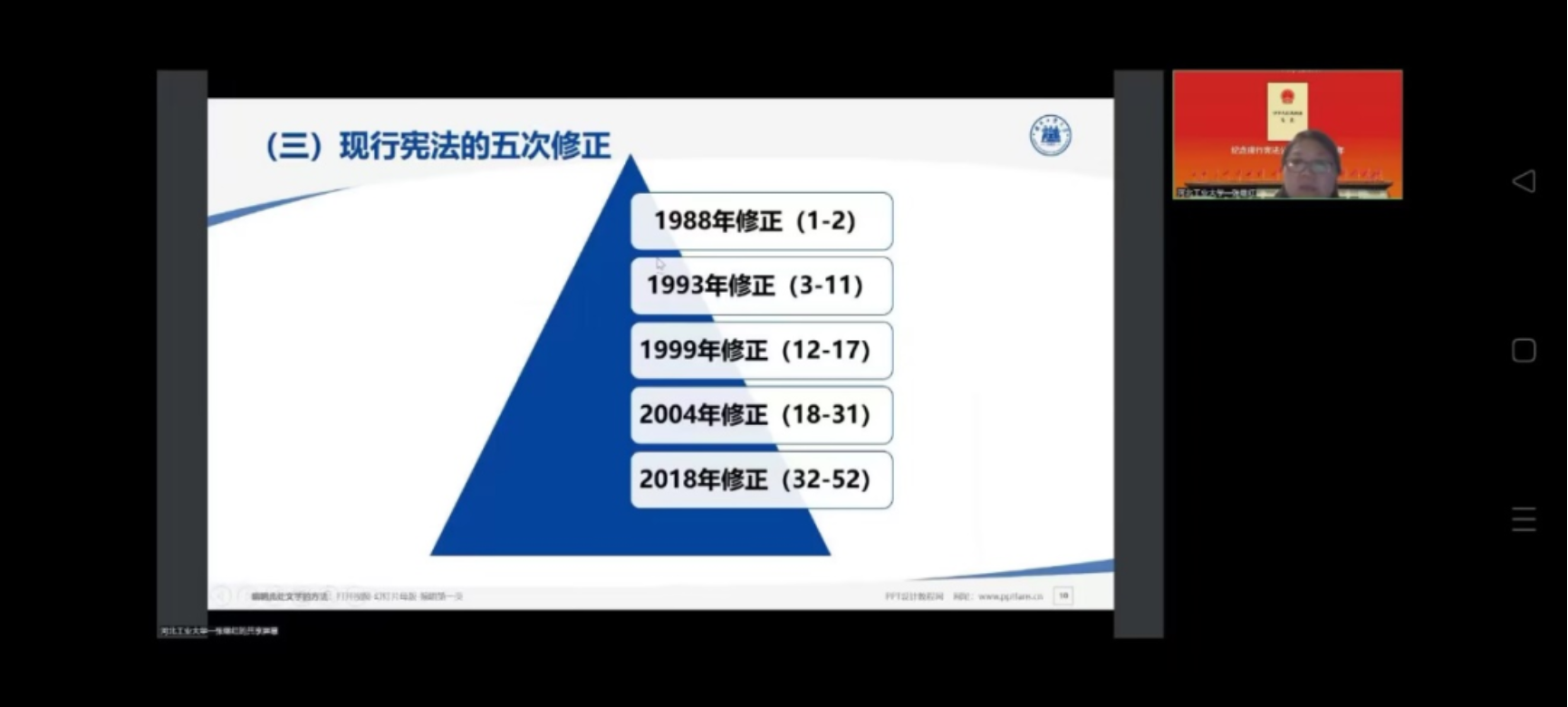 首先是由张继红老师为我们介绍。张老师告诉同学们宪法宣誓制度及宪法日的确立大大增强了宪法权威和大众心中的宪法意识。习近平总书记对于青少年学宪法的重要指示中说:“宪法是国家的根本法,是治国安邦的总章程,具有最高的法律地位,宪法教育应纳入国民教育体系,引导青少年从小掌握宪法知识,树立宪法意识,养成守法习惯。”张老师向各位同学发出倡议:作为共青团员和共产党员,我们应当做好学宪法,遵守宪法,从自己做起,维护宪法尊严和实施,带动身边的家人一起学宪法,遵守宪法。这样才能担当起宪法卫士的职责与使命。