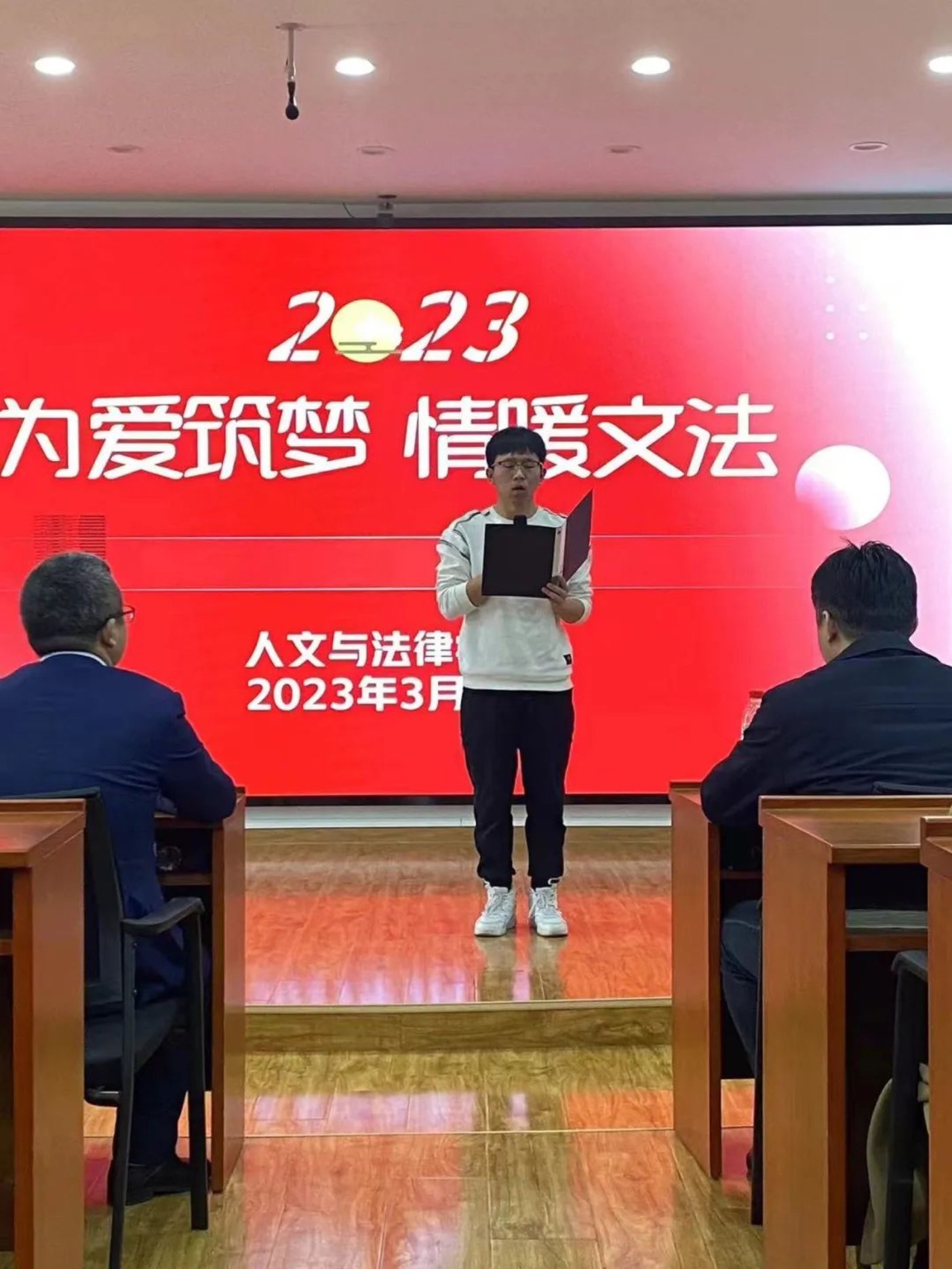 周杰同学作为学生代表,对河北省法学会和所有关心学生成长的领导、老师表达了最衷心的感谢和最崇高的敬意。周杰同学表示,“自古英雄多磨难,历来纨绔少伟男。困难不是我们的障碍,而是我们的动力。贫困虽然不是我们的选择,但它也绝不是我们选择懦弱、选择退却的借口。”他呼吁同学们坚持不懈、积极乐观地面对学习和生活,用一颗感恩的心去生活每一天,并尽己所能帮助他人,将爱传递和延续下去。顽强拼搏,砥砺奋进。坚持永不言败的信念让前行的脚步更加坚定,坚持踏实勤奋的学习让进步更加显著,坚持平实严谨的作风让道路在脚下无限延伸。