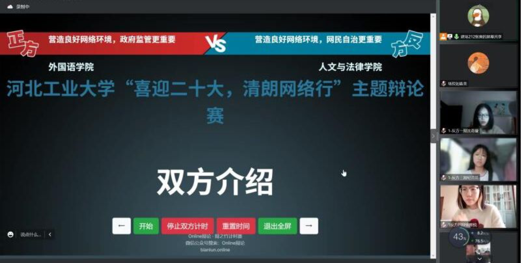 在国庆假期,喜迎二十大之际,为向全校学生宣传文明网络思想,让同学提高网络文明意识,同时也为促进辩论文化在河北工大的传播和发展,丰富同学们的大学生活,提升学生们的综合素质,展示大学生卓越的精神风貌,“喜迎二十大,清朗网络行”主题辩论赛应运而生。