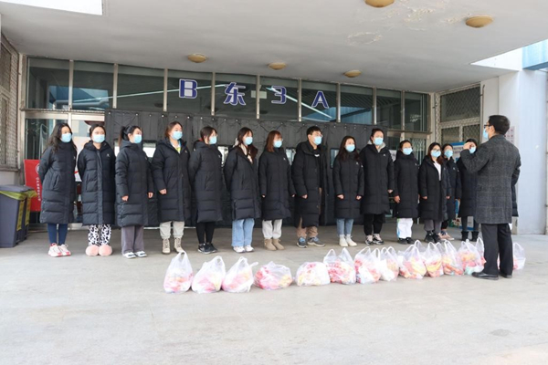 学院为每日大赛 的冬奥会志愿者们送来了新鲜的水果、酸奶和润唇膏等后备物资。
