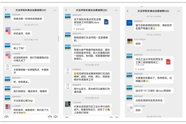 上周,在学院老师的引导与带领下,所有学院的冬奥志愿者有序、顺利地完成了三轮核酸检测。核酸检测期间,学院领导及辅导员老师对他们在疫情防护与自身安全等各方面再三关怀,切实保障了志愿者的健康状况。冬奥志愿服务培训期间正值天津迎战奥密克戎,老师们通过群聊等方式在线上对文法志愿者提出关怀、积极开导,并表示大家期间有任何问题都可以向负责老师倾诉,给予了温暖与鼓励,营造了温馨友好的师生氛围,减轻了冬奥志愿者的心理压力与负担。