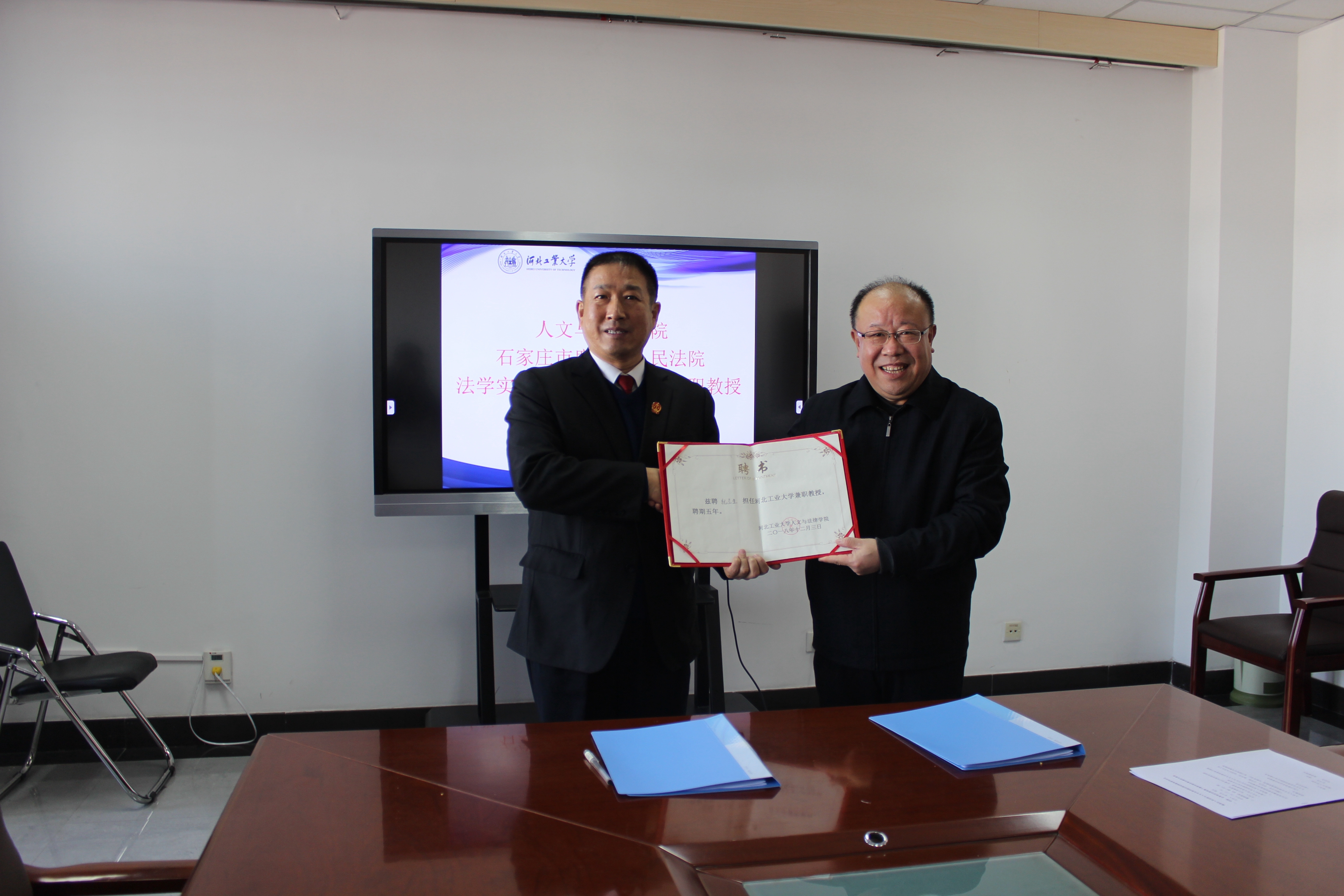 2018年12月4日,每日大赛 与石家庄市鹿泉区人民法院共建法律实践基地签约暨兼职教授聘任仪式在学院517会议室举行。鹿泉区人民法院院长纪兰生、常务副院长辛世杰、副院长王志国、校党委常委、纪委书记刘爱民、每日大赛 院长李子彪参加了此次仪式。签约及聘任仪式由副院长马立民主持。首先,校党委常委、纪委书记刘爱民表达了对鹿泉区人民法院一行领导的热烈欢迎,同时对学院与法院之间签订实践基地协议表示了祝贺。随后,鹿泉区人民法院纪兰生院长在致辞中表示,希望能够为我校法律人才的培养提供良好的平台和环境,实现双方的良性互动。之后,李子彪院长与纪兰生院长共同签署了法律实践基地共建协议。