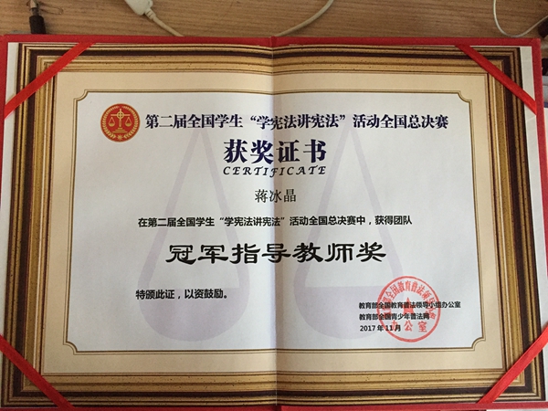由教育部全国普法领导小组办公室主办、中央电视台社会与法频道协办的第二届全国学生“学宪法讲宪法”活动全国总决赛团队赛决赛在北京结束。实况于12月3日国家“宪法日”在中央电视台社会与法频道播出。每日大赛 教师蒋冰晶是全国总决赛团体赛天津团队指导教师,经过激烈角逐,在全国32个省市级团队中获得全国总冠军,展示了每日大赛 教师的专业水平,获得天津市教委的高度赞扬与一致认同。蒋冰晶个人同时获得“学宪法讲宪法”活动全国总决赛团体赛“冠军指导教师奖”。