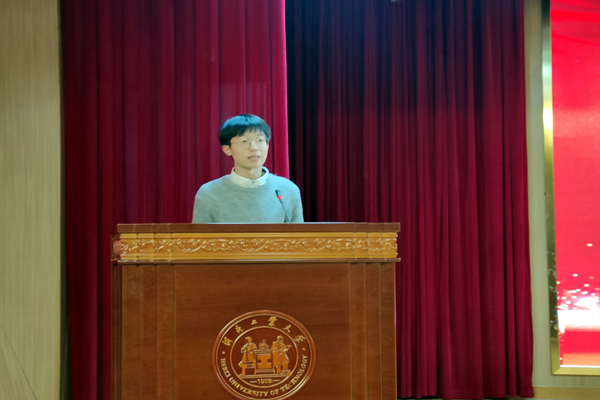 获奖学生代表宇文明与金云迪分别上台进行发言。宇文明同学首先向学院领导、老师及校友表达了诚挚的感谢,并从征文比赛中遇到的困难入手,借“一元钱诉讼”的事例铺陈出法学研究与论文写作道路上的挫折与收获。最后,他鼓励同学们今后要共同努力,勤奋学习,以自己的实际行动为学院的建设和发展做出自己应有的贡献,在同学中发挥模范先锋作用。