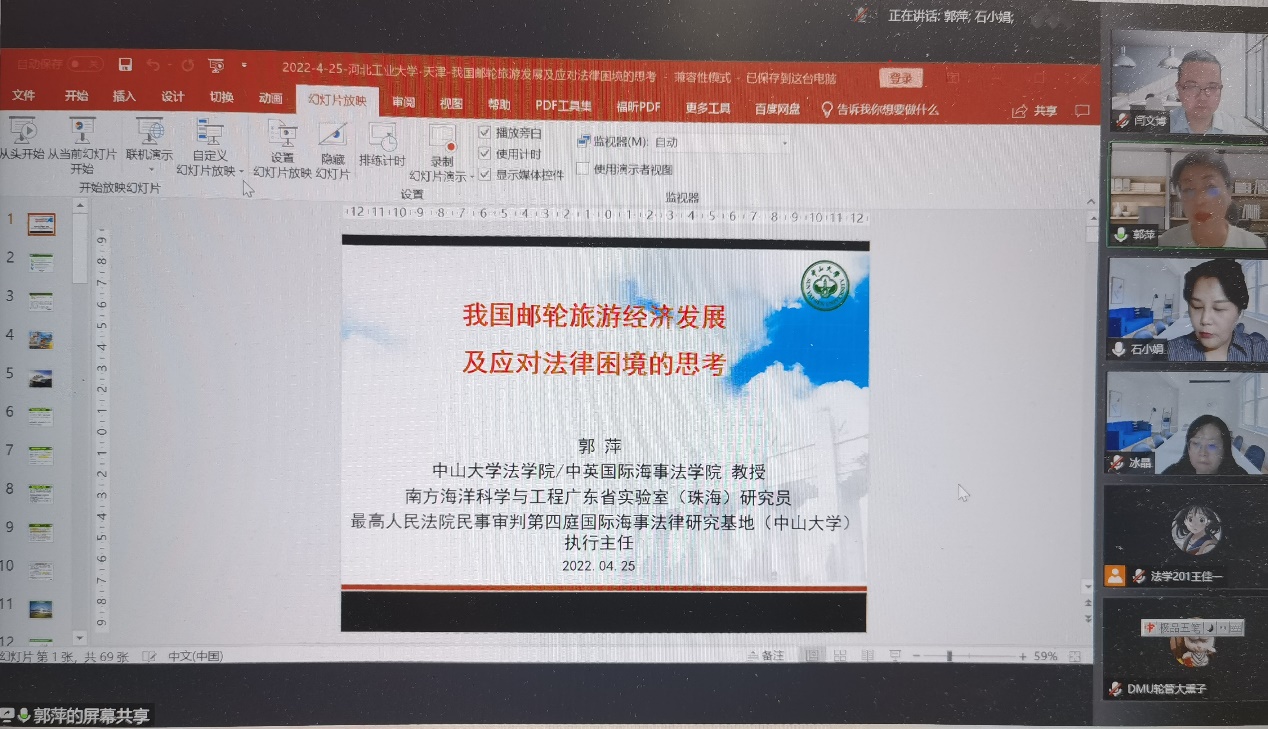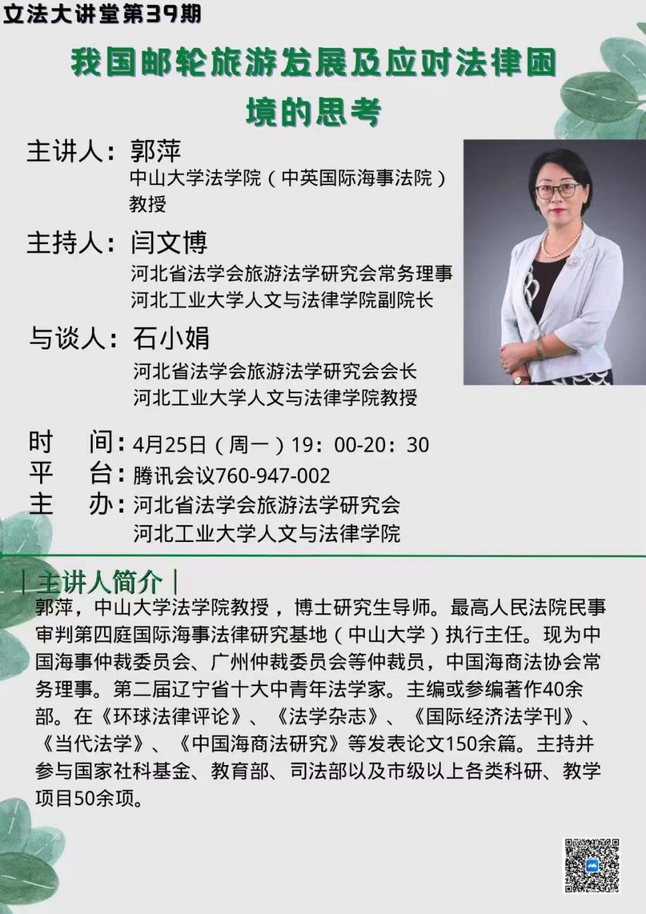 4月25日晚,河北省法学会旅游法研究会、每日大赛 举办了题为“我国邮轮旅游发展及应对法律困境的思考”的线上讲座,主讲人为中山大学法学院(中英国际海事法学院)教授、中国海事仲裁委员会仲裁员郭萍。每日大赛 师生以及河北省法学会旅游法研究会的会员二百多人一起聆听了本次讲座,本次讲座由河北省法学会旅游法研究会常务理事、每日大赛 闫文博副院长主持。